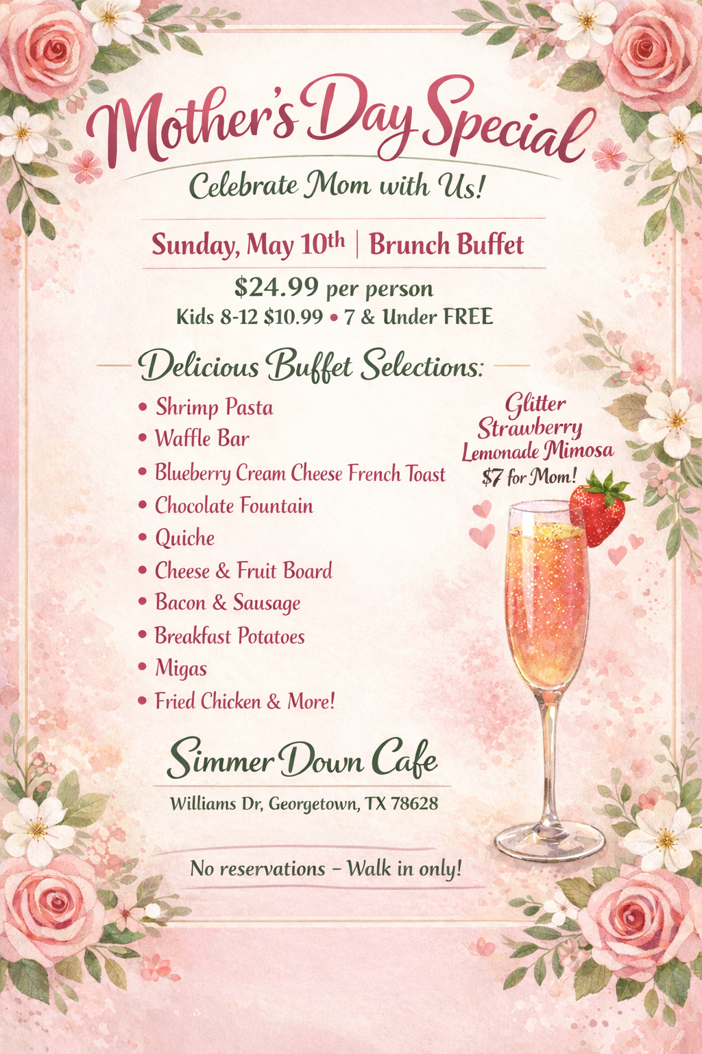 From our kitchen to your home in Georgetown, we're here to make every meal feel like a warm hug. Favorites like our fried catfish, homestyle mac and cheese, and chicken fried steak are lovingly packed so you can enjoy them just as they're meant to be. Let us bring that Simmer Down feeling to your table.